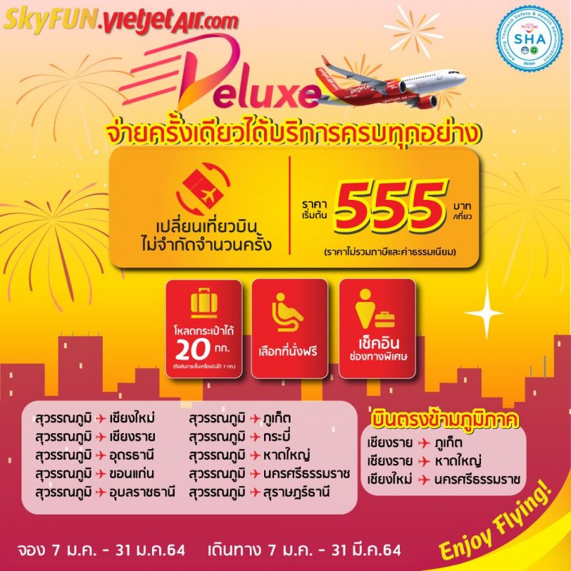 สายการบินไทยเวียตเจ็ทให้ผู้โดยสารเดินทางได้อย่างมั่นใจและปลอดภัย ด้วยโปรโมชั่น “ดีลักซ์ เซลล์” (Deluxe Sale) เสนอตั๋วโดยสารแบบดีลักซ์ (Deluxe) ในราคาพิเศษ เริ่มต้นเพียง 555 บาท (ราคาไม่รวมภาษีและค่าธรรมเนียม) ตั๋วโดยสารแบบดีลักซ์ราคาพิเศษนี้มอบสิทธิในการเปลี่ยนเที่ยวบินได้ฟรีไม่จำกัดจำนวนครั้ง รวมน้ำหนักกระเป๋าโหลดฟรี 20 กิโลกรัม สิทธิในการเลือกที่นั่งได้ฟรี และช่องทางพิเศษสำหรับเช็คอิน ผู้โดยสารสามารถจองได้ตั้งแต่วันที่ 7 – 31 มกราคม 2564 ใช้เดินทางตั้งแต่ 7 มกราคม – 31 มีนาคม 2564