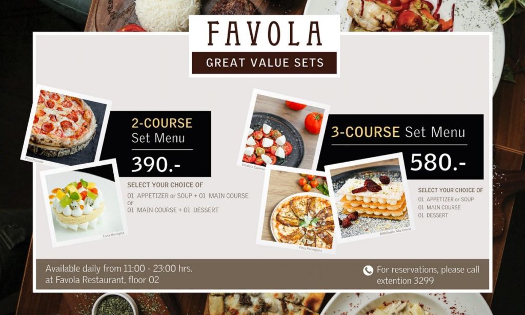 อิ่มอร่อยกับ “Favola Great Value Set” เซตเมนูอาหารสุดคุ้มจากฟาโวล่าในราคาสบายกระเป๋า ที่ให้คุณได้เลือกทานเมนูอาหารอิตาเลียนจานโปรดสำหรับมื้อกลางวันหรือมื้อเย็น ในราคาเริ่มต้นเพียง 390 บาท