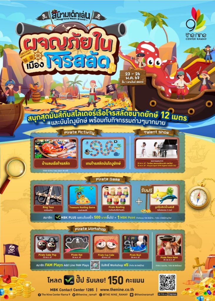 เดอะไนน์ เซ็นเตอร์ พระราม 9 ศูนย์การค้า ใน เครือเอ็ม บี เค ต้อนรับเปิดเทอม เชิญชวนผู้ปกครองและเด็ก ๆ ทุกคนร่วมสัมผัสบรรยากาศท่องโลกแห่งการเรียนรู้สุดมัน ในงาน สนามเด็กเล่น : ผจญภัยในเมืองโจรสลัด ระหว่างวันพฤหัสบดีที่ 23 พฤษภาคม – วันอาทิตย์ที่ 26 พฤษภาคม 2567  ณ ลานไนน์ สแควร์ ชั้น 1 ศูนย์การค้าเดอะไนน์ เซ็นเตอร์ พระราม 9