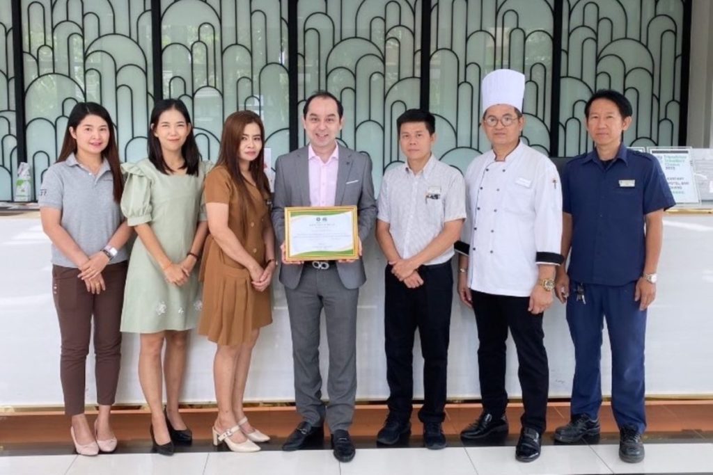 กิตติเดช คุ้มม่วง (คนที่ 4 จากซ้าย) ผู้จัดการโรงแรมแคนทารี บ้านฉาง พร้อมด้วยพนักงานโรงแรมฯ ร่วมแสดงความยินดีและเป็นสักขีพยานที่ โรงแรมแคนทารี บ้านฉาง ได้รับใบประกาศนียบัตรโรงแรมที่เป็นมิตรกับสุขภาพและสิ่งแวดล้อม (GREEN Health Hotel) จากกระทรวงสาธารณสุข โดยกรมอนามัย ณ โรงแรมแคนทารี บ้านฉาง