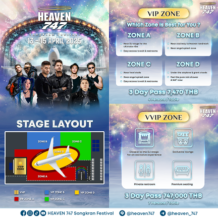 นอกจากนี้ยังสนุกสุดขีด! กับจุดเล่นน้ำ 360 องศารอบเครื่องบิน มาร่วมเป็นส่วนหนึ่งของพิธีขอฝน เพื่อสร้างพลัง 747 และเติมเต็มพลังแห่งท้องฟ้าไปด้วยกัน! ที่สำคัญที่สุด! งานนี้เปิดให้ทุกคนเข้าร่วมได้ฟรี Line UP MC DJ ระดับโลกกว่า 23 คน คือ DJ Beauz, DJ DUBVISION, DJ RAYRAY, DJ VINAI, DJ WUKONG, DJ BOTCASH, DJ KARTY, DJ SURA, DJ TTINA, MC BIZZO, MC BOOMER, DJ BUBBLEPAINT, DJ BVZSERX, DJ DAISY, DJ H2H, DJ JAY SCHEMA, DJ KANSHRIYA, DJ l33, MC MIIU, DJ NEIL, DJ QUEEN NARA, DJ SUNDAY SUNDAE, DJ ZARA GIFT
