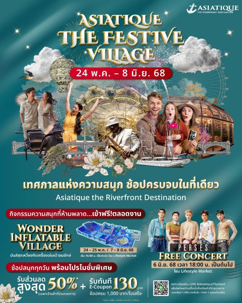 เอเชียทีค เดอะ ริเวอร์ฟร้อนท์ เดสติเนชั่น จัดกิจกรรมสร้างประสบการณ์แห่งความสุขสนุกกับงาน ‘ASIATIQUE THE FESTIVE VILLAGE’ ตั้งแต่วันที่ 24 พฤษภาคม – 8 มิถุนายน 2568 ทั้งเล่น ช้อป ฟรีคอนเสิร์ต และโปรโมชั่นพิเศษมากมาย
