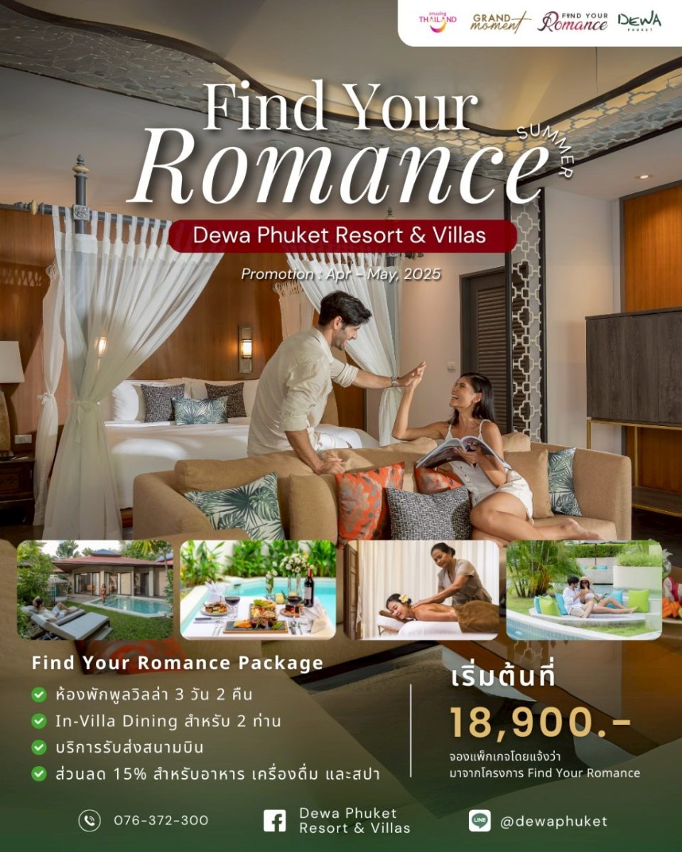 อย่าพลาดโอกาสที่จะสร้างความทรงจำแสนหวานในช่วงซัมเมอร์นี้! เลือกเที่ยวไทย เติมเต็มทุกความโรแมนติกและทำให้ทุกวันเป็นวันพิเศษกับคนที่คุณรัก! ติดตามข่าวสารเพิ่มเติม สำหรับผู้สนใจ แพ็กเกจ Find Your Romance Summer สามารถติดต่อสถานประกอบการพันธมิตรโดยแจ้งชื่อแพ็กเกจ หรือติดต่อสอบถามได้ที่ Facebook : Amazing Thailand Find Your Romance ตั้งแต่วันนี้จนถึง 31 พฤษภาคม 2025 เท่านั้น