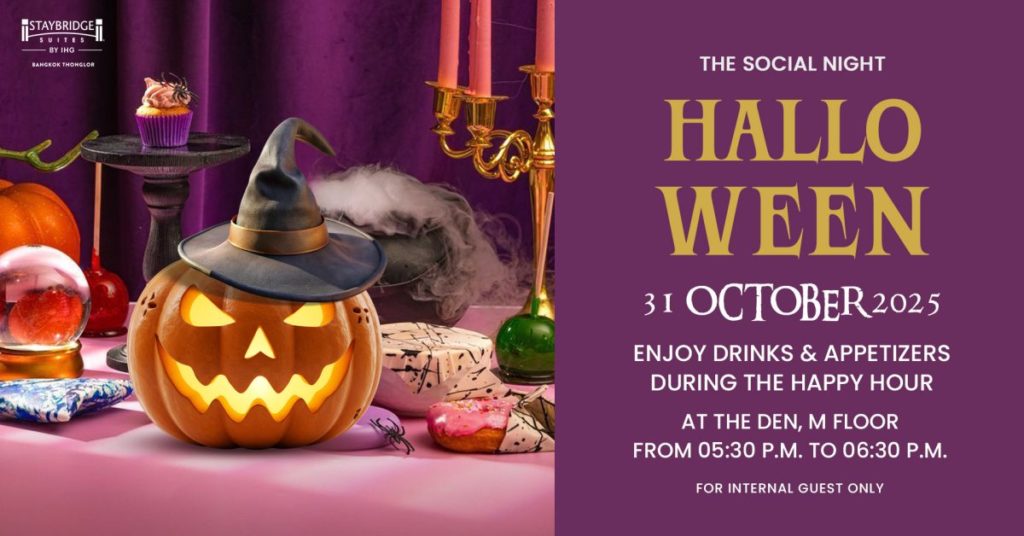 โรงแรมสเตย์บริดจ์ สวีท แบงค็อก ทองหล่อ ขอเชิญชวนลูกค้าที่เข้าพักมาร่วมค่ำคืนแห่งความสนุกสุดหลอนในงาน The Social Night ธีม ฮาโลวีน ที่จะจัดขึ้นในวันศุกร์ที่ 31 ตุลาคม 2568 ให้คุณได้สนุกสนานท่ามกลางธีมฮาโลวีน เพลิดเพลินไปกับอาหารทานเล่นและเครื่องดื่มมากมาย พร้อมพบปะพูดคุยสังสรรค์กับเพื่อนใหม่ในงานในบรรยากาศสุดชิลที่คุณไม่ควรพลาด!