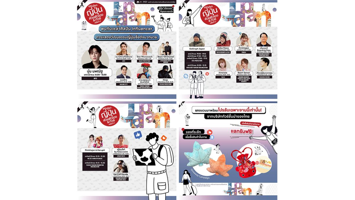 - วันอาทิตย์ที่ 23 พฤศจิกายน 2568 วันสุดท้ายของการจัดงาน พบกับเหล่า YouTuber และ Blogger สายเจแปนที่จะมาเล่าประสบการณ์เที่ยวญี่ปุ่นแบบ Unseen ที่จะทำให้คุณอยากแพ็กกระเป๋าทันที อาทิ แอดอ้น แอดมินเพจ Go!Graph Japan, นัท Eat Chill Wander, ฮารุปี้ Harupiii, เคนจิ หรือมะม่วง ญี่ปุ่นมั้ย? by Kenji และแขกรับเชิญพิเศษ หมอช้าง ทศพร ศรีตุลา พร้อมรับชมโชว์ “นินจา” สุดว้าวที่ส่งตรงจากประเทศญี่ปุ่น