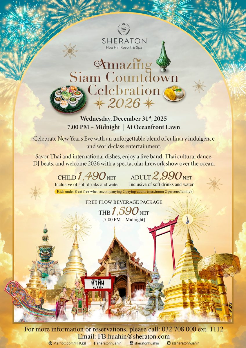 นับถอยหลังสู่ศักราชใหม่ริมทะเลในสไตล์ Amazing Siam ด้วยค่ำคืนสุดพิเศษที่รวบรวมความสนุกและสีสันแห่งการเฉลิมฉลองไว้ครบถ้วนทั้งบุฟเฟต์อาหารไทยและนานาชาติ การแสดงนาฏศิลป์ไทย ดนตรีสด ดีเจ และพุดอกไม้ไฟ บรรยากาศที่ผสมผสานความรื่นเริงและความประทับใจ จะทำให้คืนสุดท้ายของปีเต็มไปด้วยความทรงจำที่ยากลืมเลือน ในราคาเริ่มต้น 2,990 บาทสุทธิ รวมซอฟต์ดริ้งค์และน้ำดื่ม โปรโมชั่น Early Bird ส่วนลด 10% เมื่อสำรองที่นั่งระหว่างวันที่ 1-15 ธันวาคม 2568