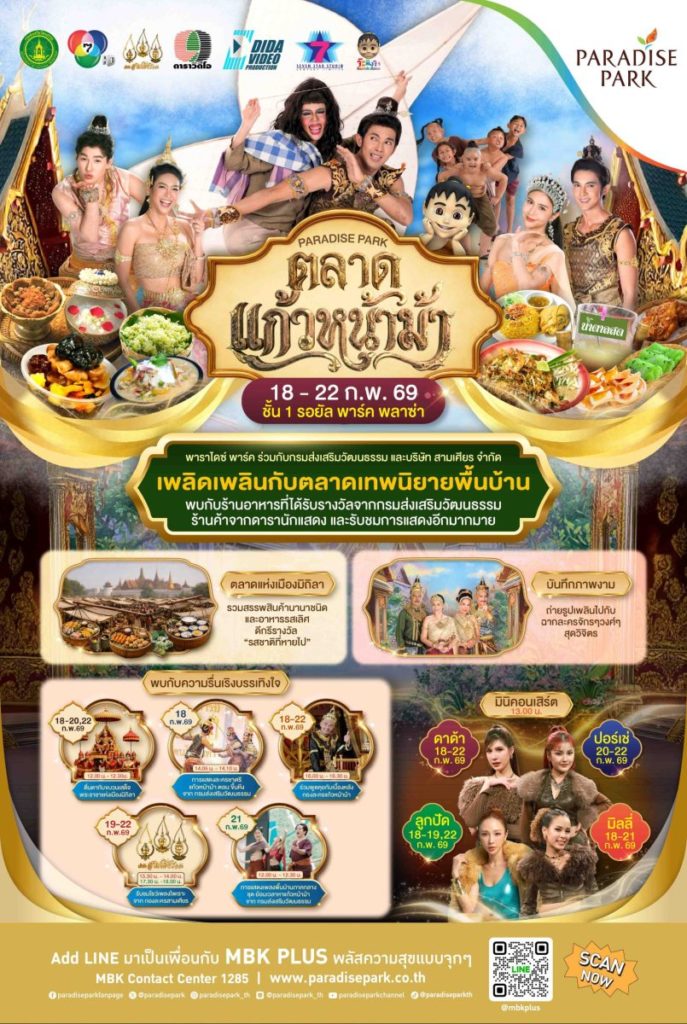 มาเพลิดเพลิน เดินช้อป ชม ชิล และสัมผัสเสน่ห์วัฒนธรรมไทยในบรรยากาศเทพนิยายพื้นบ้านในงาน “ตลาดแก้วหน้าม้า” ระหว่างวันพุธที่ 18 – วันอาทิตย์ที่ 22 กุมภาพันธ์ 2569 ณ ชั้น 1 ลานรอยัล พาร์ค พลาซ่า ศูนย์การค้า พาราไดซ์ พาร์ค
