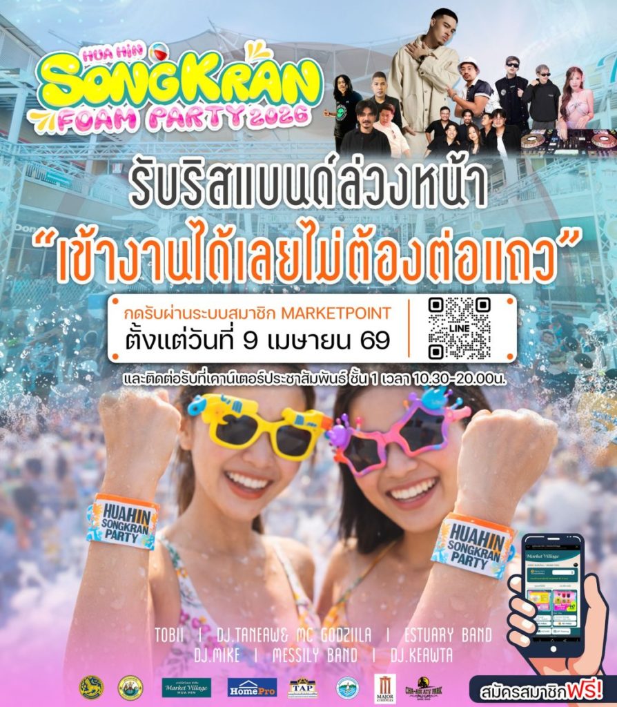 นับถอยหลังสู่ความสนุก “Market Village Huahin SongKran Foam Party 2026 ” 13 เมษายน 69 นี้ ตั้งแต่ 11.00น. เป็นต้นไป!! #เข้างานฟรี ชวนทุกท่านมาเตรียมตัวรับริสแบนด์ล่วงหน้า เพียงสแกน QR CODE ในภาพ หรือแอดไลน์ @markethuahin สมาชิกเดิมกดเข้าสู่เมนูคูปองเพื่อรับ E-Ticket สำหรับใช้เข้างานฟรี!! ( 1 User / 1 Whritband * เด็กที่อยู่ภายใต้ความดูและของผู้ปกครองเข้าฟรี ทันที ) ระบบจะเปิดให้กดรับตั้งแต่วันที่ 9 เม.ย. 69 นี้ ผ่านระบบสมาชิก Market Point